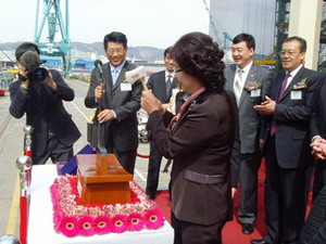 30日中午,韓國蔚山港現(xiàn)代重工造船廠賓客如織,人頭攢動,來賓們紛紛聚集到“COSCO KOREA”命名儀式現(xiàn)場,見證這一美好的時刻。COSCO KOREN大型集裝箱船長達350米,寬余40米,載重量高達10萬噸,可裝載8500個標準集裝箱(TEU),由加拿大SEASPAN(塞斯潘)公司出資,現(xiàn)代重工建造,中遠集裝箱運輸有限公司租賃。命名交船儀式在現(xiàn)代重工造船廠碼頭舉行,張良副總裁夫人劉蘭英女士按慣例為新船命名、敲香檳。隨后,參加儀式的各方代表合影留念并登船參觀。