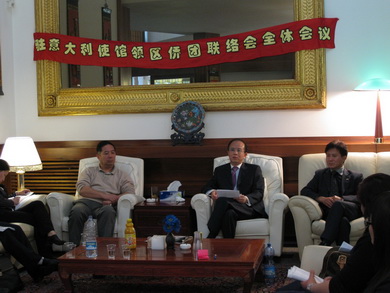 2010年5月13日,中國(guó)駐意大利大使丁偉在官邸召開羅馬領(lǐng)區(qū)僑團(tuán)聯(lián)絡(luò)會(huì)全體會(huì)議。陳國(guó)友參贊、唐友京參贊、領(lǐng)事部全體人員,使館領(lǐng)區(qū)23個(gè)主要僑團(tuán)的聯(lián)絡(luò)員或代表,中文學(xué)校及華文媒體代表近40人出席。與會(huì)人員圍繞旅意僑胞生存、融入、發(fā)展的現(xiàn)狀、子女教育及遇到的困難,對(duì)使館領(lǐng)事工作的意見、建議,中國(guó)文化年等議題展開了熱烈的討論。