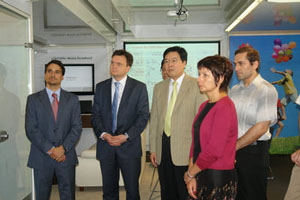 房大使與多拉(右二)、多林副部長(zhǎng)(左二)觀(guān)摩演示 房大使與多拉(左一)、多林副部長(zhǎng)(左二)交談