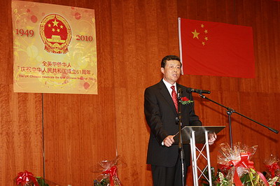 2010年9月14日,全英華僑華人慶祝中華人民共和國(guó)成立61周年晚會(huì)在倫敦IBIS酒店隆重舉行。劉曉明大使夫婦應(yīng)邀出席,與全英僑界450多位代表歡聚一堂,共慶祖國(guó)華誕和中秋佳節(jié)。秦剛公使、張建國(guó)武官、陸旭參贊等陪同。