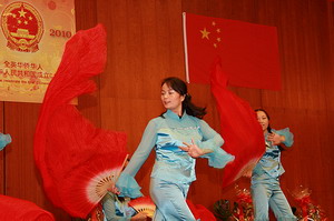 晚會(huì)上,僑領(lǐng)們陪同劉大使夫婦一道切祖國(guó)生日蛋糕,共唱《歌唱祖國(guó)》。華人文藝團(tuán)體還準(zhǔn)備了豐富多彩的文藝表演。頗具中國(guó)傳統(tǒng)色彩的民族舞蹈、少林功夫等節(jié)目,給晚會(huì)增添了歡樂(lè)、喜慶的氣氛。