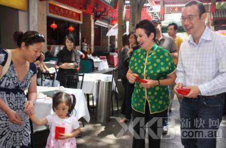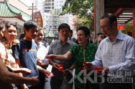 中新網(wǎng)1月31日電 據(jù)澳大利亞新快網(wǎng)報(bào)道,悉尼市長(zhǎng)摩雅(Clover Moore)與悉尼市市議員郭耀文當(dāng)?shù)貢r(shí)間1月29日(星期六)上午到唐人街拜年。他們沿途向唐人街商家和路人發(fā)紅包,恭賀新年。