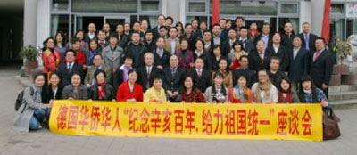 2011年3月31日,由旅德華僑華人中國(guó)和平統(tǒng)一促進(jìn)會(huì)牽頭,旅德僑界在柏林舉行“紀(jì)念辛亥百年、給力祖國(guó)統(tǒng)一”座談會(huì)。駐德國(guó)大使吳紅波、領(lǐng)事部主任黎一建參贊以及全德華僑華人聯(lián)合總會(huì)、全德華人社團(tuán)聯(lián)合會(huì)、巴伐利亞州華商聯(lián)合會(huì)、漢堡華僑華人聯(lián)合總會(huì)等30多個(gè)僑團(tuán)代表、華僑華人、臺(tái)灣同胞近80人出席。新華社、中央電視臺(tái)、人民日?qǐng)?bào)、中國(guó)國(guó)際廣播電臺(tái)以及《歐洲新報(bào)》等多家媒體到場(chǎng)報(bào)道。