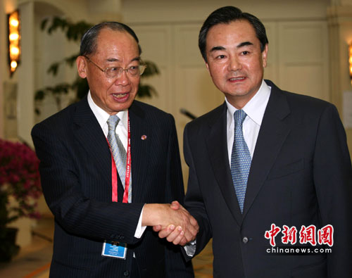 中共中央臺辦、國務(wù)院臺辦主任王毅4月10日在海南博鰲為前來出席博鰲亞洲論壇2010年年會的臺灣兩岸共同市場基金會最高顧問錢復(fù)一行舉辦招待酒會。中新社發(fā) 王辛莉 攝