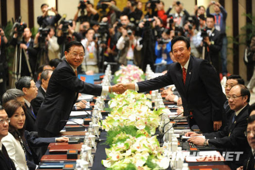 4月26日上午,海峽兩岸關系協(xié)會會長陳云林與海峽交流基金會董事長江丙坤在南京舉行會談。這是兩會恢復協(xié)商后領導人第三次會談。新華社記者 韓瑜慶攝