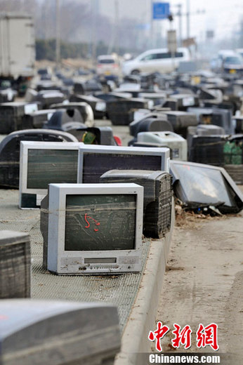2011年3月13日,青森縣,在遭受地震襲擊后,被毀壞的電視機散落在街道上。