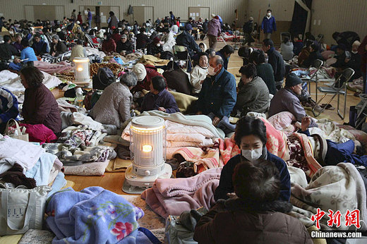 3月15日,日本9.0級大地震和海嘯發(fā)生后。日本巖手縣難民躲到避難場所。