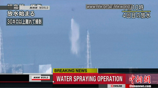 東京電力公司稱,直升機(jī)灑水前的當(dāng)?shù)貢r間17日上午9時40分,福島核電站核輻射量數(shù)值為3782微西弗,灑水后30分鐘,在離第三反應(yīng)堆數(shù)十米的同一地點(diǎn)進(jìn)行了檢測,得到的數(shù)值為3754微西弗,放水前后的數(shù)值基本上沒有什么變化。