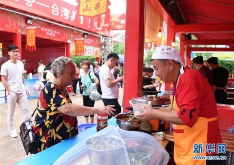 6月14日,廈門(mén)市民在兩岸特色廟會(huì)上品嘗臺(tái)灣美食。 當(dāng)日,第十一屆海峽論壇·兩岸特色廟會(huì)在廈門(mén)舉行。 新華社記者 林善傳 攝