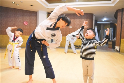 在閩臺(tái)家園臺(tái)灣青年創(chuàng)新創(chuàng)業(yè)基地跆拳道館,臺(tái)灣青年創(chuàng)業(yè)者陳燕亭(前左)帶孩子們熱身。新華社記者 宋為偉 攝