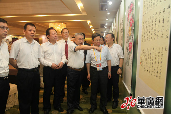 參加第八屆海峽論壇“同名村 心連心”聯(lián)誼活動開幕式的嘉賓參觀中華情 兩岸緣同名(同宗)村書畫作品展。 (華廣網(wǎng)吳勇攝)