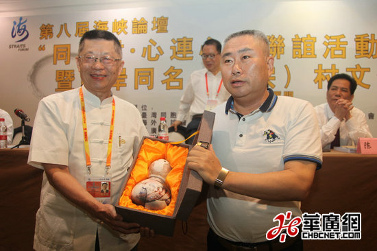 臺灣閩臺同宗同名村交流中心主任陸炳文向本次大陸主辦方中國華藝廣播公司總經(jīng)理艾克贈送信物“德化瓷葫蘆形猴面粥米罐”。 (華廣網(wǎng)吳勇攝)