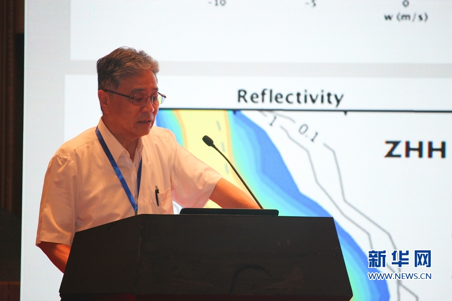 臺(tái)灣大學(xué)大氣科學(xué)系教授周仲島現(xiàn)場(chǎng)作“登陸臺(tái)風(fēng)的雙偏振雷達(dá)觀測(cè)”主題演講。新華網(wǎng) 劉默涵 攝
