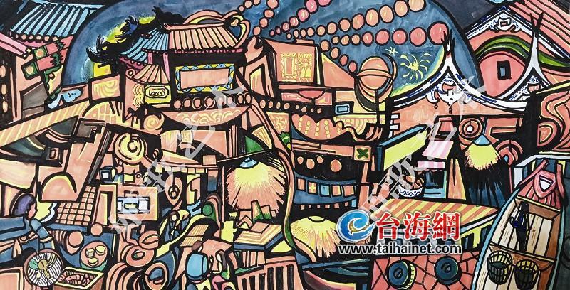 作品繪制了閩南漁女、風(fēng)獅爺、媒人丑角,分別代表了閩臺民俗文化、信仰文化、戲劇文化。以祥云裊裊和特色建筑作為背景,從各方面展現(xiàn)了豐富多彩、同根同源的閩臺風(fēng)情。
