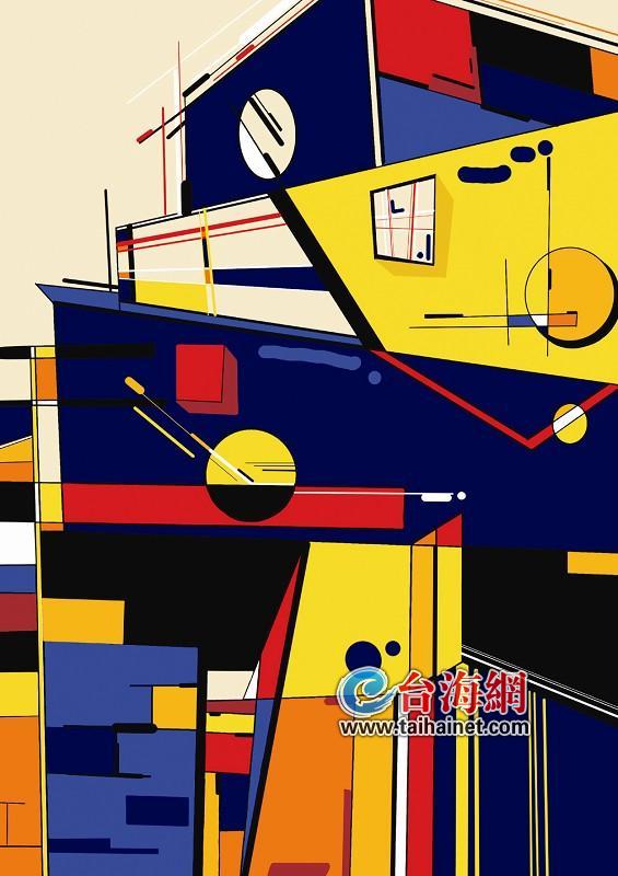 集裝箱是兩岸港口常見的意象,也是當(dāng)今快節(jié)奏生活的縮影。在這幅作品中,它們不再是堅硬而冰冷的、抽象化的色塊,色彩熱烈而富有生機,冷與暖交織,表達兩岸青年新思想與生活激情的碰撞。