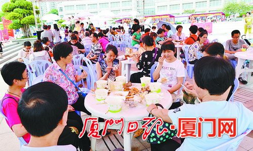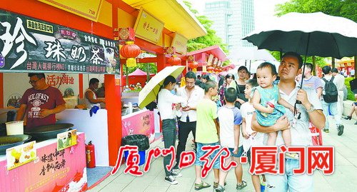 昨天上午10時許,海滄市民文化廣場上,來自兩岸的特色美食香味四溢,紅、黃兩色帳篷下,到處人頭攢動,熱鬧非凡。眾多市民游客聞訊而來,競相品嘗來自臺灣的地道美食。據(jù)介紹,本屆廟會共設(shè)攤位210個,其中170家來自臺灣,覆蓋臺灣21個縣市,規(guī)模之大超越往屆。
