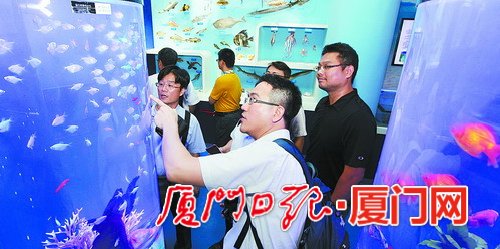 參加海峽兩岸水產增養(yǎng)殖與病害學術研討會的臺灣嘉賓參觀福建海洋漁業(yè)科學館。