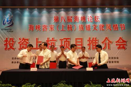 6月13日,第八屆海峽論壇·海峽客家(上杭)族譜文化風情節(jié)投資上杭項目推介活動舉行,現(xiàn)場簽約大地生機(福建)農(nóng)業(yè)發(fā)展有限公司增資擴股、閩臺文化藝術創(chuàng)作展示與旅游基地、跨境電商農(nóng)特產(chǎn)品保稅倉及高雄觀光協(xié)會旅游合作等4個項目?h委常委、常務副縣長胡濱,副縣長袁靜出席活動。