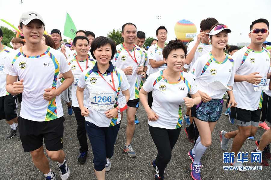 6月13日,奧運(yùn)乒乓球冠軍鄧亞萍(右三)、來自臺灣的雅典奧運(yùn)會跆拳道亞軍黃志雄(左一)與健跑者一起奔跑。
