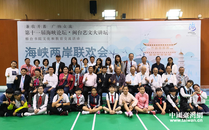 兩岸嘉賓在福州中山小學(xué)室內(nèi)籃球場(chǎng)開(kāi)展聯(lián)誼活動(dòng)合影。(中國(guó)臺(tái)灣網(wǎng)發(fā))