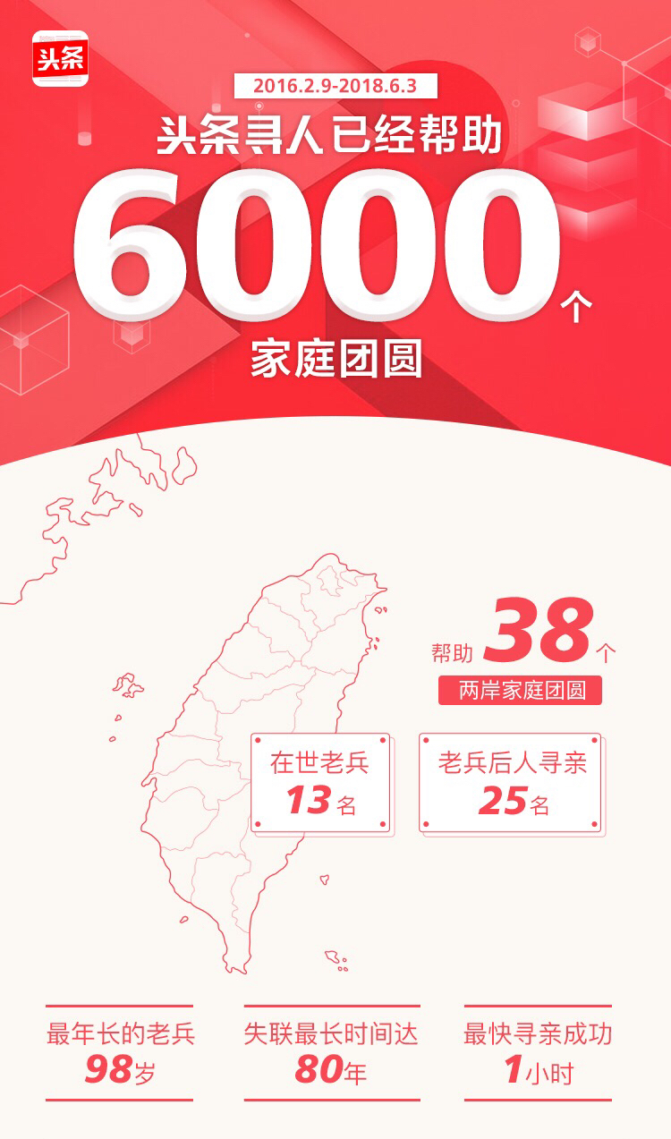 目前為止,今日頭條兩岸尋親項(xiàng)目已經(jīng)幫助38個(gè)兩岸家庭團(tuán)圓,當(dāng)中有25個(gè)成功案例是赴臺(tái)老兵的后人尋找大陸親屬,占比達(dá)2/3;另有13位是赴臺(tái)老兵本人尋親。這些健在的老兵當(dāng)中。年紀(jì)最大的已經(jīng)98歲,跟家鄉(xiāng)親人失聯(lián)時(shí)間最長(zhǎng)的有80年;尋親速度最快的一個(gè)案例,頭條尋人僅用了1個(gè)小時(shí),就幫助老兵尋找到了大陸的親人。