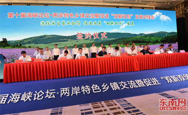 會(huì)議期間,共有62對(duì)閩臺(tái)特色鄉(xiāng)鎮(zhèn),促進(jìn)“雙新雙創(chuàng)”發(fā)展項(xiàng)目進(jìn)行對(duì)接并簽訂合作協(xié)議。在與會(huì)領(lǐng)導(dǎo)、嘉賓的鑒證下,15對(duì)合作項(xiàng)目上臺(tái)現(xiàn)場(chǎng)簽約。7位嘉賓圍繞促進(jìn)“雙新雙創(chuàng)”發(fā)展主題作了內(nèi)容豐富的精彩演講。會(huì)后,各地還將開展“臺(tái)灣農(nóng)民福建行”活動(dòng),組織邀請(qǐng)臺(tái)灣對(duì)接企業(yè)代表、臺(tái)灣農(nóng)業(yè)專家、杰出農(nóng)民、優(yōu)秀農(nóng)村實(shí)用人才分別赴我省各設(shè)區(qū)市和6個(gè)國(guó)家級(jí)臺(tái)灣農(nóng)民創(chuàng)業(yè)園實(shí)地參訪交流,在各臺(tái)創(chuàng)園舉辦“臺(tái)灣青年農(nóng)民中華農(nóng)耕文化福建行”活動(dòng),增進(jìn)兩岸青年農(nóng)民的交流與互動(dòng)。