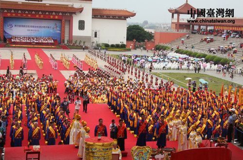 兩岸千余名媽祖信眾在天后廣場(chǎng)進(jìn)行盛大的媽祖祭祀大典活動(dòng)。(中國(guó)臺(tái)灣網(wǎng) 郭瑩瑩 攝)