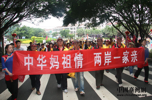 來(lái)自臺(tái)灣的媽祖信眾代表手持“中華媽祖情、兩岸一家親”的標(biāo)語(yǔ)走向天后宮。(中國(guó)臺(tái)灣網(wǎng) 郭瑩瑩 攝)
