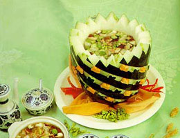 3.將鴨、冬瓜、陳皮、姜塊、蔥條、米仁放入場(chǎng)鍋中,加清水5杯,用大火燒開(kāi)鍋后,烹入米酒、精鹽3荼匙,改用小火提至酥 爛,放入精鹽2茶匙調(diào)味即成。
