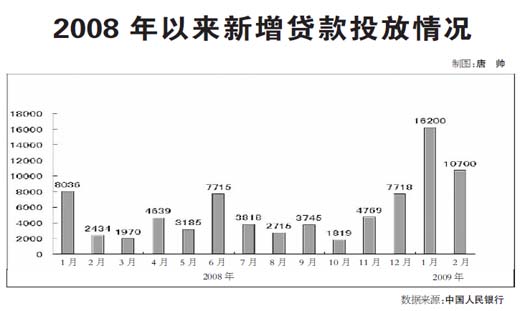 再?gòu)膶?shí)踐看,前兩月人民幣貸款大幅猛增了2.69萬億元。這是信貸規(guī)模限制取消、4萬億元政府投資項(xiàng)目啟動(dòng)等外因與銀行慣于“早投放、早受益”等內(nèi)因碰頭的結(jié)果,隨著政府投資項(xiàng)目中優(yōu)質(zhì)項(xiàng)目被不斷“瓜分”,加上各家銀行開始適度控制信貸投放進(jìn)度,信貸增長(zhǎng)將逐步回落。但從全年看,仍有望在5萬億元以上。