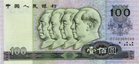 一點:100元的正面是新中國四位重要領(lǐng)導(dǎo)人毛澤東、劉少奇、周恩來、朱德的側(cè)面頭像,表達了對黨領(lǐng)導(dǎo)的中國革命和建設(shè)光輝歷史的充分肯定;50元券的正面是工人、農(nóng)民和知識分子并列的頭像,強調(diào)知識分子屬于工人階級的一部分,這是思想認識上的一項重大的撥亂反正;10元券以下票面的正面都是具有代表性的民族人物的頭像。