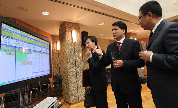 12月15日,在俄羅斯莫斯科銀行間外匯交易所,中國駐俄羅斯大使李輝(右二)等人觀看盧布對人民幣交易情況。盧布對人民幣掛牌交易當(dāng)日在俄羅斯莫斯科銀行間外匯交易所正式啟動,這也是人民幣首次在中國境外直接掛牌交易。 新華社記者魯金博攝