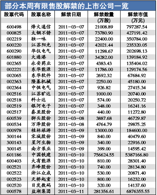 從個(gè)股的解禁市值來看,鹽湖集團(tuán)位居首位。數(shù)據(jù)顯示,該公司的28.14億股的限售股將于3月11日解禁。如果按照該公司停牌前的24.44元的價(jià)格計(jì)算,解禁市值達(dá)到688億元。中國(guó)鐵建緊隨其后,該公司75.66億股有限售條件的股票3月10日出籠,解禁市值達(dá)到539億元,兩者合計(jì)解禁市值達(dá)到1227億元,占下周總解禁市值的80%。