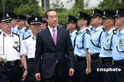 五月三十日上午,香港特區(qū)政府政務(wù)司唐英年司長(zhǎng)出席此間舉行的“香港輔助警察隊(duì)五十周年暨結(jié)業(yè)典禮閱操儀式”時(shí),檢閱剛剛完成入職培訓(xùn)的輔警隊(duì)生力軍,及完成晉升、延續(xù)訓(xùn)練的輔警。 中新社發(fā) 鄭祚聲 攝
