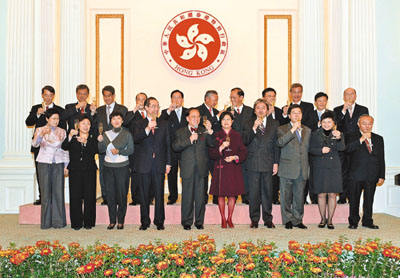 曾蔭權(quán)在新春酒會上祝愿大家在新一年像老虎一樣,充滿干勁和力量。圖為曾蔭權(quán)伉儷與特區(qū)政府高級官員向嘉賓祝酒。(圖片來源:香港文匯報)
