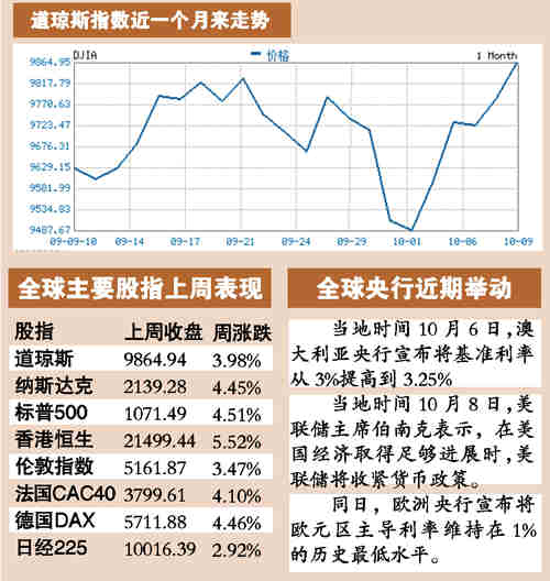上周全球股市大幅上漲,主要股指平均漲幅超過(guò)4%。紐約三大股指上周五收盤(pán)小幅上漲,道指收于9864.94點(diǎn),創(chuàng)一年來(lái)新高,離萬(wàn)元大關(guān)僅一步之遙。香港恒指上周漲1123.95點(diǎn),漲幅達(dá)5.52%。