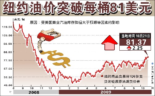 受弱勢(shì)美元指數(shù)和大幅減少的汽油庫(kù)存影響,10月21日,紐約原油期貨的收盤價(jià)一年來首次突破每桶81美元。