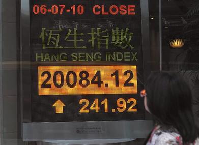 7月6日,市民從香港灣仔一家銀行的恒生指數(shù)電子顯示屏前走過。當(dāng)日,香港恒生指數(shù)上漲241.92點(diǎn),重上20000點(diǎn),收報(bào)20084.12點(diǎn)。 新華社記者 黃本強(qiáng)攝