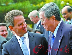 美國財(cái)長蓋特納(左)和中國央行行長周小川出席G20財(cái)長會(huì)議。