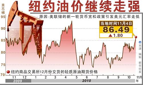 國際油價上周出現(xiàn)“五連陽”,紐約商業(yè)期貨交易所(NYMEX)12月原油期貨上周五收報86.85美元/桶,超過今年的最高收位86.84美元,且錄得2008年10月8日以來的最高結算價。盤中最高達到87.22美元/桶,為2008年10月9日以來的最高水平。
