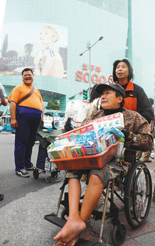 臺北市百貨公司廣場前,一名坐輪椅的中年男子兜售雜貨,兩相對照更凸顯臺灣貧富差距越來越大。 圖片來源:臺灣《聯(lián)合報》