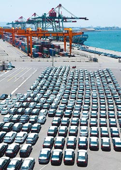 趕在奢侈稅6月1日開征前,巴拿馬籍烏托邦公爵號(hào)汽車船,29日載著總數(shù)共一千輛的BMW、BENZ汽車抵達(dá)臺(tái)中港,碼頭上停滿百萬以上亮閃閃的進(jìn)口車海。 圖片來源:臺(tái)灣《中國(guó)時(shí)報(bào)》