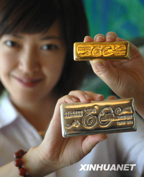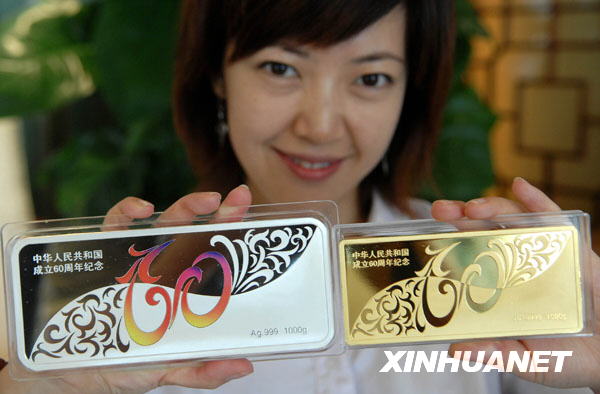 7月14日,工作人員展示新中國(guó)成立60周年紀(jì)念金銀條龍騰系列。由中國(guó)印鈔造幣總公司制造發(fā)行、中鈔國(guó)鼎公司總經(jīng)銷的中華人民共和國(guó)成立60周年紀(jì)念金銀條,將于7月23日在北京菜百商場(chǎng)首發(fā)。該套產(chǎn)品分為龍騰系列和鳳舞系列。新華社發(fā)