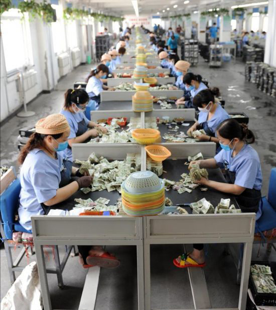 “數(shù)錢數(shù)到手抽筋”是很多人的夢想,但對於鄭州公交總公司結(jié)算中心點鈔部的120多名專職點鈔人員來說,這句話描述的正是他們每天工作所面對的現(xiàn)實。鄭州市公交總公司現(xiàn)有280多條公交線路,近四千臺公交車。每臺公交車當(dāng)日收班后,投幣箱內(nèi)的票膽都會被送到點鈔部,在經(jīng)過統(tǒng)一整理送往點鈔室,分發(fā)給各位點鈔員進(jìn)行人工清點。在點鈔室裡,穿著藍(lán)色工作服、戴口罩的點鈔員們先將票膽內(nèi)的紙、硬幣分開﹔硬幣被送往專門的機器進(jìn)行清點,紙幣清點則需要用手工方式完成。紙幣清點完畢之后,打好捆的鈔票會被送往復(fù)核組接受驗鈔機檢驗,確認(rèn)無誤后再送往銀行。據(jù)介紹,每位點鈔員每天要清點約60個投幣箱,1萬余張紙鈔。新華社記者 李博 攝