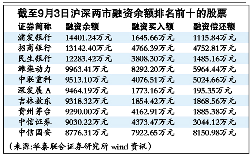 數(shù)據(jù)顯示,截至2010年9月3日,滬深兩市融資余額排名前三名的股票分別是浦發(fā)銀行、招商銀行、民生銀行,其次依次是濰柴動力、中聯(lián)重科、深發(fā)展A、吉林敖東、貴州茅臺、中信證券、中信國安。從這些股票所分布的行業(yè)來看,金融服務(wù)、交運(yùn)設(shè)備、機(jī)械設(shè)備、采掘、食品飲料和化工是主流。