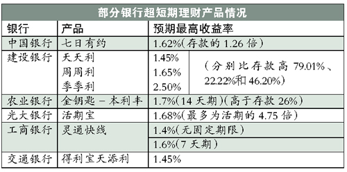 在政策尚未明朗,投資方向也難以把握,不少投資者手中的“活錢”也多了起來,超短期的銀行理財(cái)產(chǎn)品也因此密集發(fā)行,年收益率一般在1.4%~2%之間,高的達(dá)到活期利率的近5倍。