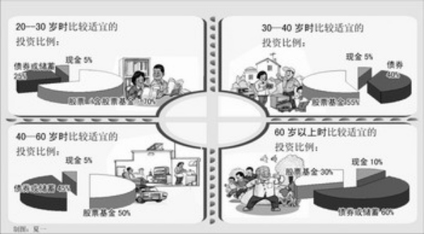 摩根士丹利華鑫基金公司副總經(jīng)理秦紅表示,一般隨著年齡增長(zhǎng),投資者的風(fēng)險(xiǎn)承受能力會(huì)逐步降低,因此需調(diào)整激進(jìn)型理財(cái)工具(如:股票基金)和穩(wěn)健型理財(cái)工具(如:債券基金、超短債基金、貨幣市場(chǎng)基金)的投資比例。