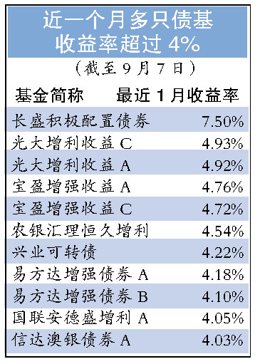 截至9月7日,最近一個月有11只債券基金的月凈值漲幅超過4%,漲幅居前的三只債券基金——長盛積極配置債券基金、光大增利收益C、光大增利收益A單位凈值分別上漲了7.5%、4.93%和4.92%。