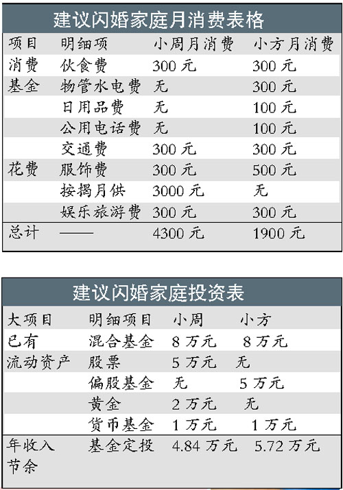 半年之前,廣州白領(lǐng)小周、小方在朋友聚會(huì)上一見鐘情,決定“閃婚”。小周27歲,是某外資企業(yè)的工程師,年薪10萬(wàn)元,現(xiàn)有公寓一套,月供3000元,還差7年才供完;另有銀行存款11萬(wàn)元,股票5萬(wàn)元。小方26歲,是某國(guó)企的財(cái)務(wù)人員,年薪8萬(wàn)元,現(xiàn)有基金10萬(wàn)元,現(xiàn)金4萬(wàn)元,無(wú)自有住宅,搬來(lái)與小周一起住。請(qǐng)教理財(cái)人士,兩人該如何理財(cái)?