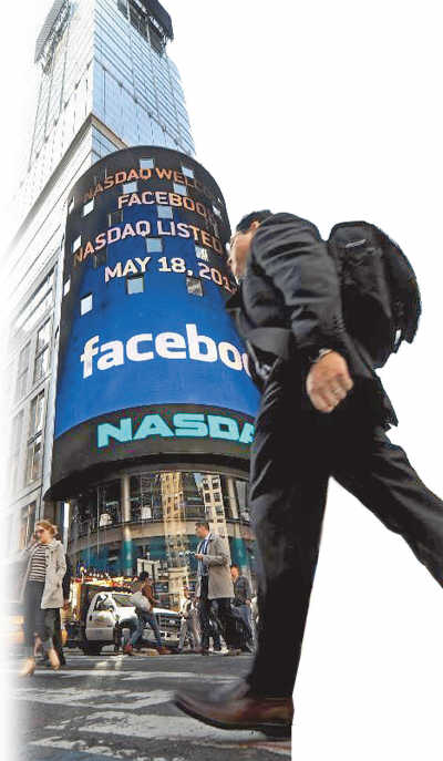 美國紐約納斯達克證券交易所的電子顯示屏上顯示出“臉譜”在納斯達克上市的消息。資料圖片
